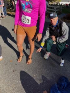 Assisting with the certification of the course and the production of the race was longtime friend and former Hartford Track Club president Peter Hawley, who lives up in the northwest corner of Connecticut, and frequently runs Litchfield county races, as well as those in West Hartford. Additionally, a classmate from The Hotchkiss School, who trained in cross country skiing when they were together in Lakeville, had flown in from Colorado. She saw that there was a race, and jumped in. Landau was delighted to see Kim Kosciusko, a retired EMS Helicopter