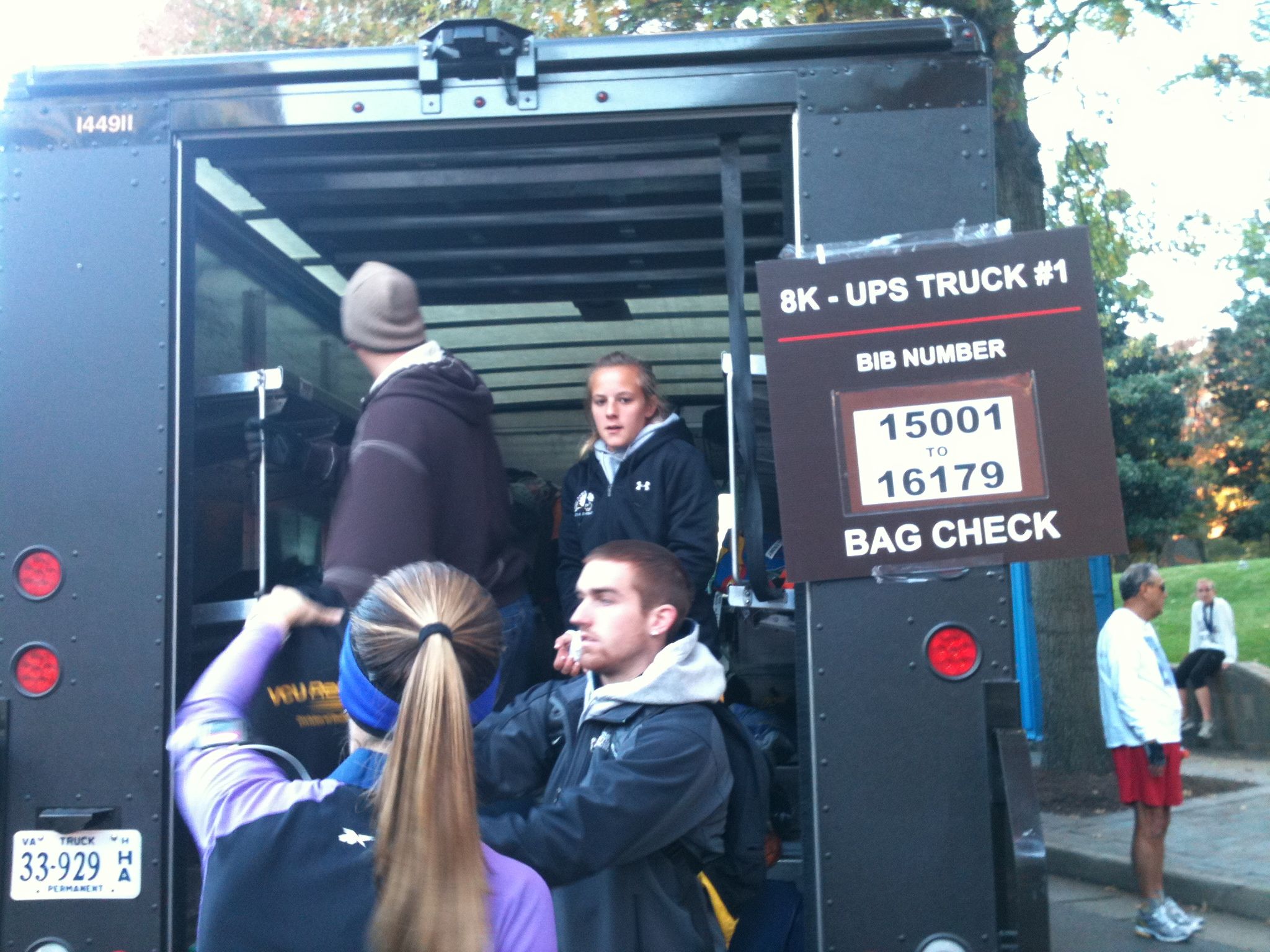 UPS bag drop at the Richmond Marathon Races – runners could drop off their bags and dry clothes after warming up and then pick them up after crossing the finish line
